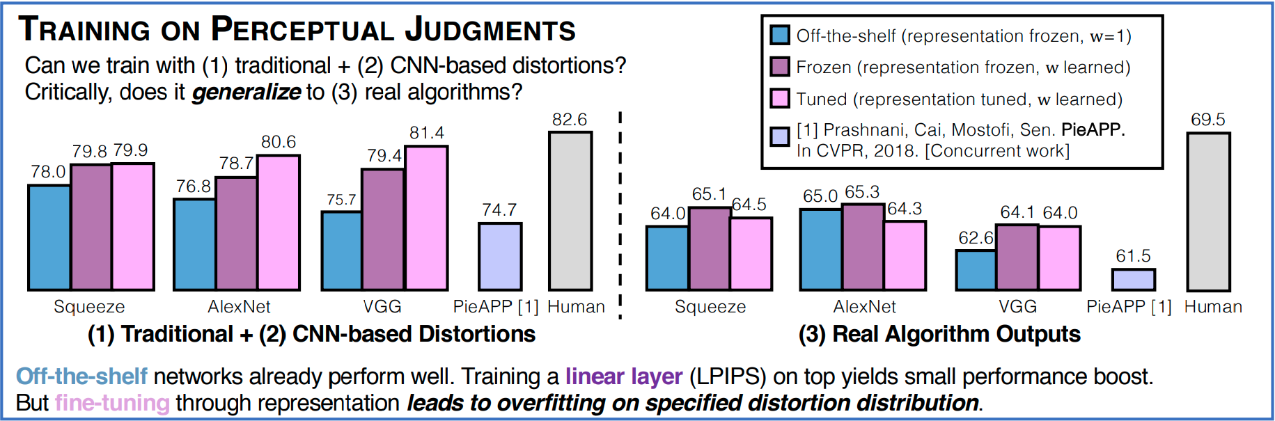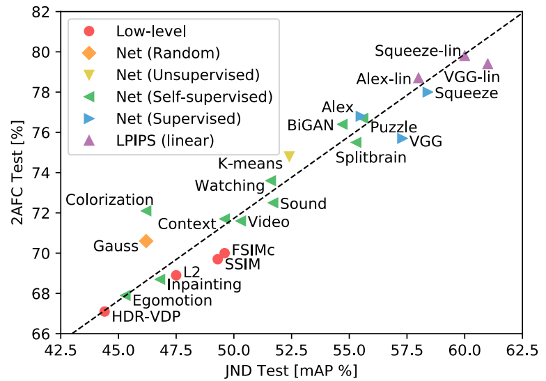 - VGG / Alex / Squeeze 를 비교해보면 네트워크 구조에 무관하게 인간의 시각 인지 능력과 부합한다.