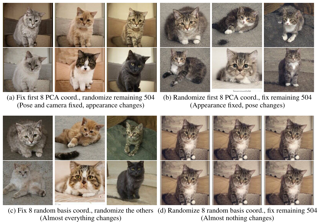 - PCA를 통해 초기 주성분들이 데이터의 전체적이고 공통된 요소를 각각 구별(disentangled)하며 나타낸다는 것을 발견.