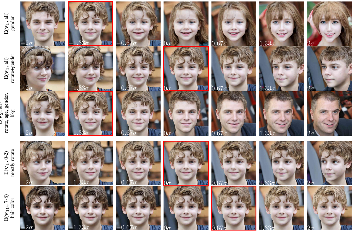 - E(u_i,j-k): i번째 주성분을 StyleGAN의 j~k번째 layer에 입력되는 w-벡터에서만 수정하여 생성할 수 있다.