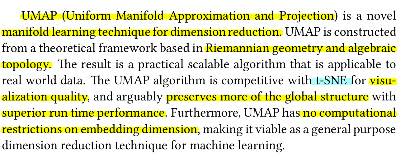 UMAP은 주어진 manifold가 uniform 하다는 가정 하에 차원 축소의 관점에서 manifold learning을 수행할 수 있다.