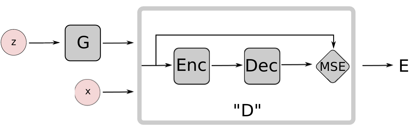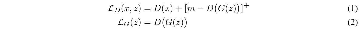 여기서 주목할 부분은 hinge loss로 정의된 max(0, m - D(G(z))) 이다. 어떤 양수 margin m에 대해서 reconstruction loss가 m보다 작은 경우에 대해서만 gradient를 갖는다.