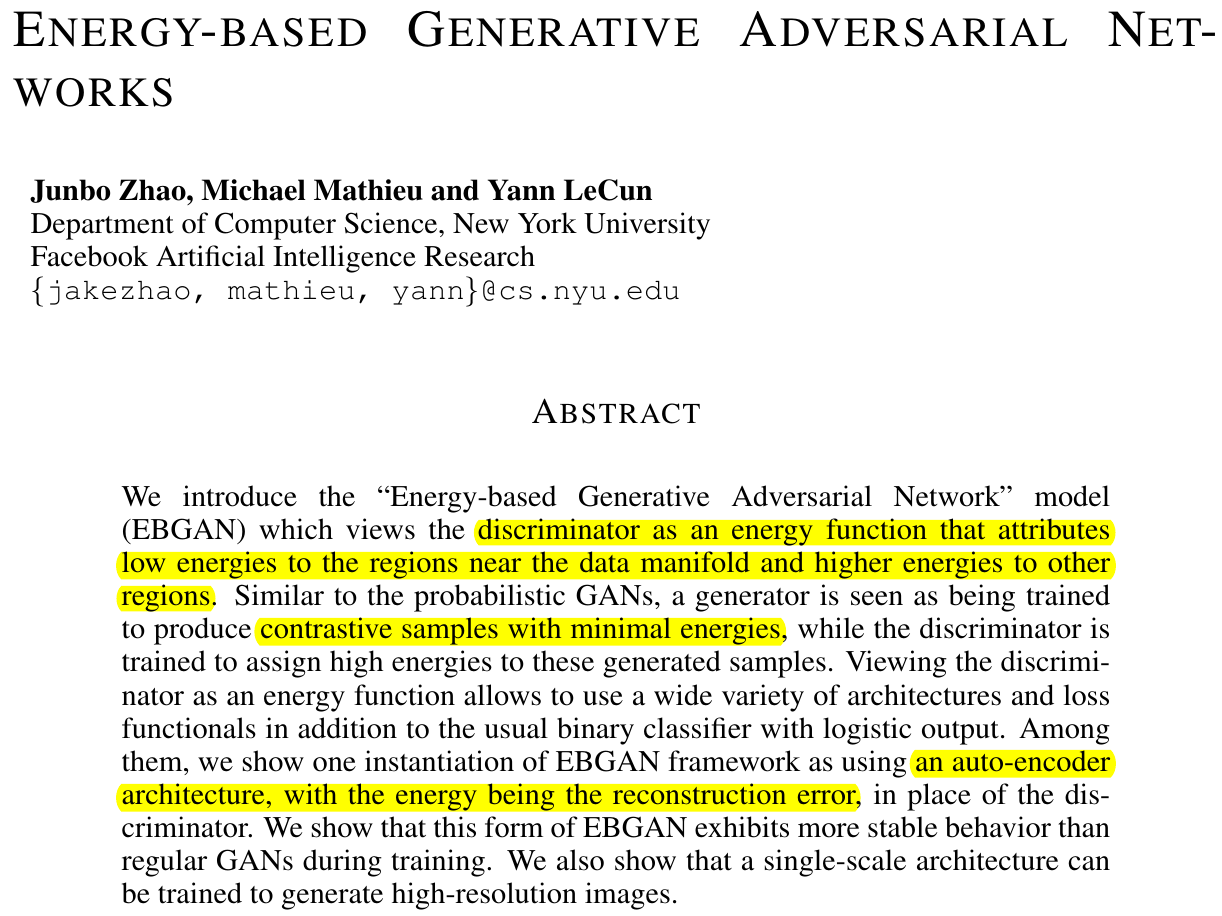GAN을 에너지 기반 관점에서 바라보며, 이를 위해 GAN과 Auto-encoder를 결합한 네트워크 구조를 제안한다.