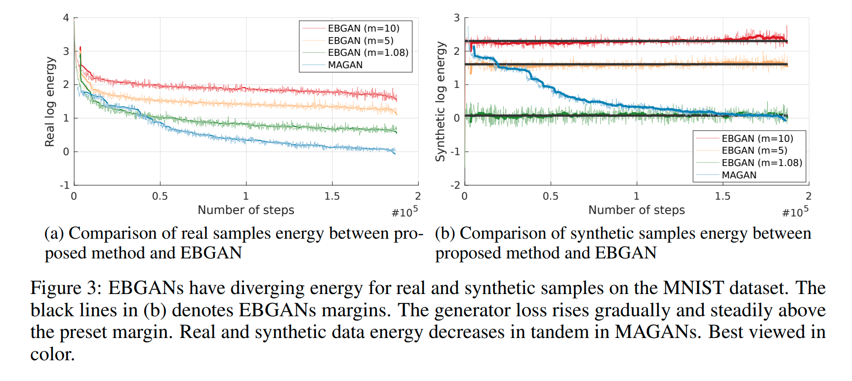 semi-supervised learning에 적용할 때에는 m의 값을 점진적으로 낮추어 가는 방법이 성능 향상에 매우 효과적이었다. 고정된 margin보다 학습에 따라 margin을 작게 변화시키는 게 중요하다. 비슷하게 고정된 margin을 사용하지 않는다는 관점에서 EBGAN을 발전시키면서 제안된 논문이 아래 Margin Adaptation GAN (MAGAN)이다.