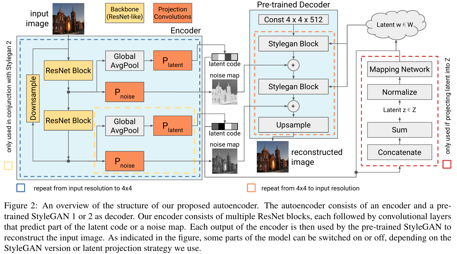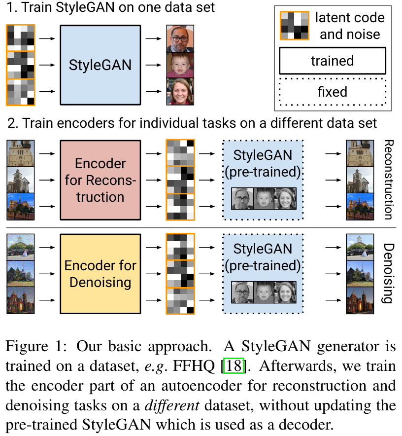 StyleGAN 기반의 오토인코더 구조를 제안하였고, 기존 Image2StyleGAN 논문에서도 밝혀졌듯이 추가적인 학습 없이도 다양한 도메인 데이터를 복원할 수 있음을 보인다. 본 논문의 contribution은 stylegan의 noise에 대해서 탐구하여 얻은 결과이다.