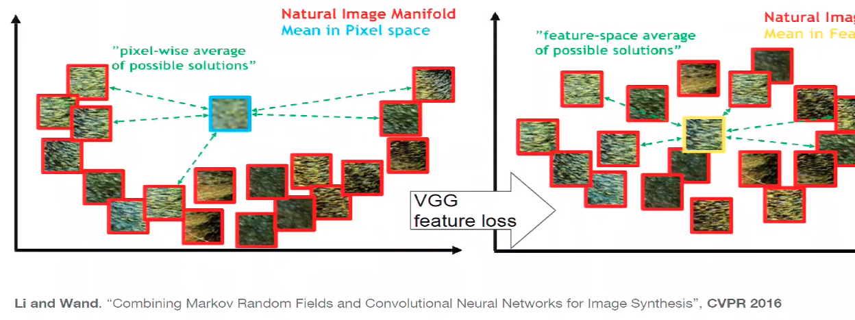 Feature distance에서의 평균값을 찾게된다면 blurry한 image reconstruction을 갖지 않게 된다. 또한, Discriminator는 실제 이미지의 분포를 이해할 수 있기 때문에 출력된 이미지를 natural image domain에 놓이도록 유도한다.