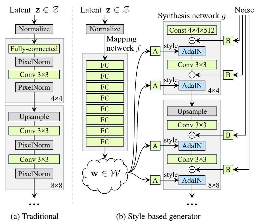 그러나 StyleGAN은a learned constant input을 사용하여, 생성자의 각 convolutional layer에서 latent code z가 mapping network를 통과하여 생성된 intermediate latent code w에 의해서 이미지의 특징을 서로 다른 scale에 따라 변형된다.
